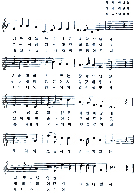교명밑에 새싹은 녹색으로 표현되었는데 하늘과 산과 들판의